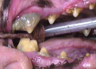 Most pets have a large amount of tartar (calculus) present on their teeth from prolonged accumulation. During a professional dental cleaning, an ultrasonic scaler is used to remove all of the tartar. The calculus is removed from the surface of the tooth and also from the gingival pocket underneath the gum line. It is only then that the teeth can be examined properly.